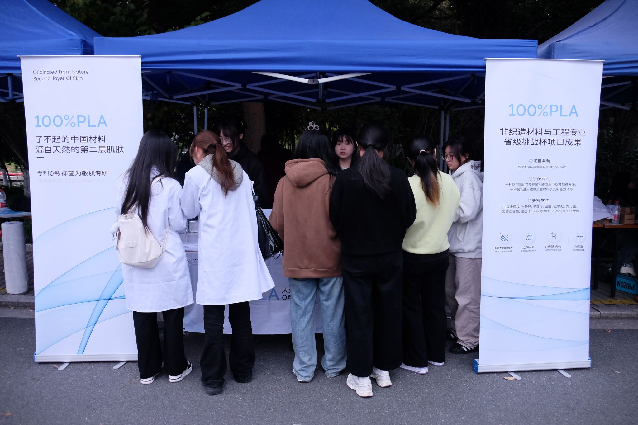 为了鼓励学生了解和参与到非织造材料的创新实践中来,本次文化节特别设立了教师产学研创新作品展示环节。其中非织造系教师与企业合作研发的100%PLA非织造卫生产品成为关注焦点。研发的完全可降解的环保材料已实现产业化应用,广泛用于个人护理用品中,其成功研发和推广,充分展示了非织造材料在可持续发展中的潜力,同时也为企业带来了显著的经济和社会效益,体现了非织造专业在服务产业升级和技术创新中的积极作用。