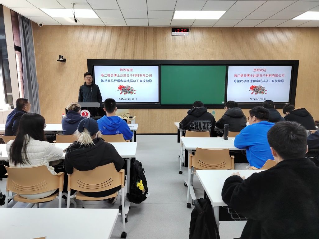 3月19日下午,浙江德美博士达高分子材料有限公司李成祥技术总监和陈祖武总经理一行访问了拷贝漫画 轻化工程系,并为生态合成革班学生讲授《合成革化学品》课程(“时尚皮革与合成革现代产业学院”的校企共建产业课程之一)。洪新球博士主持活动。