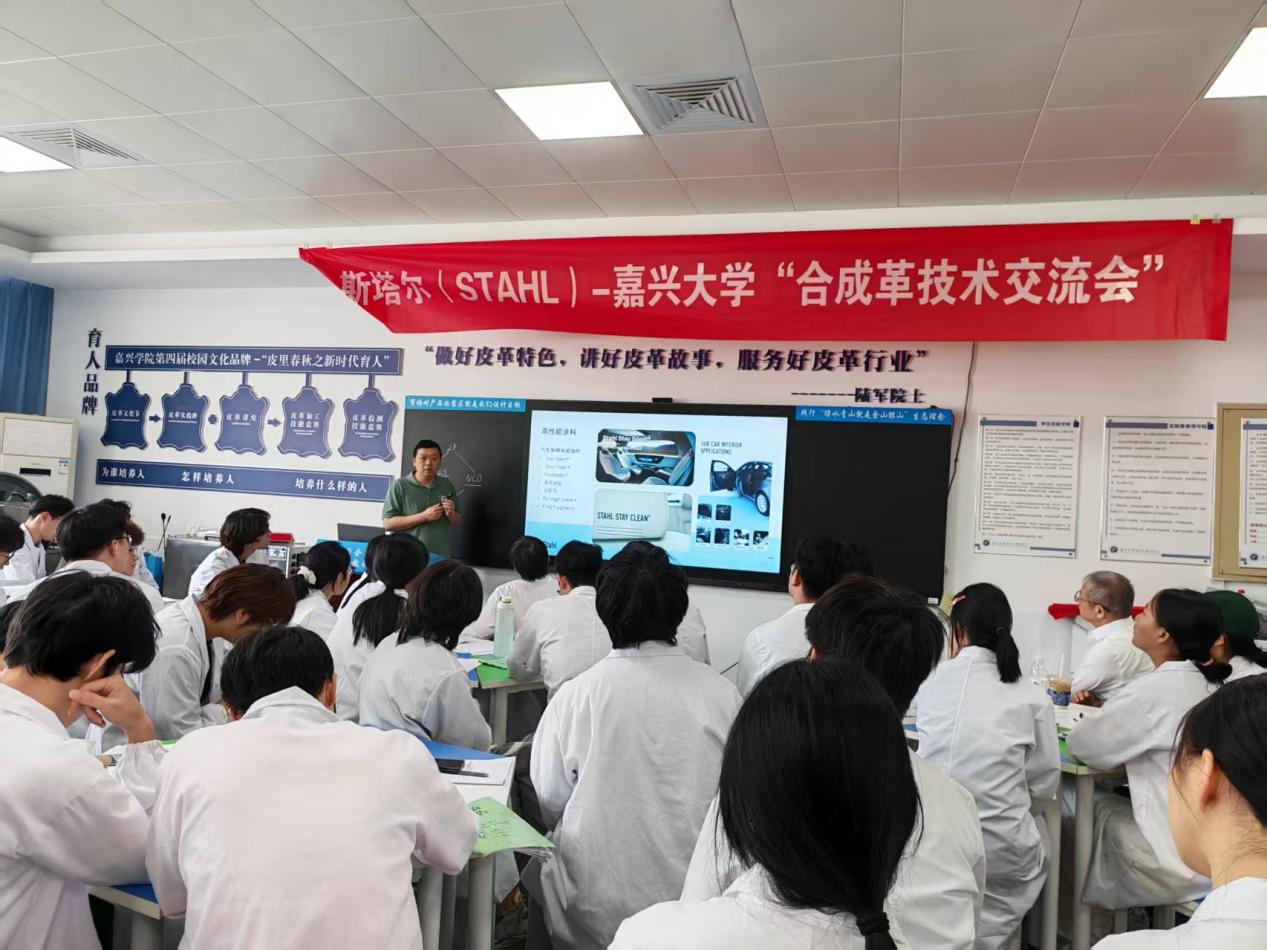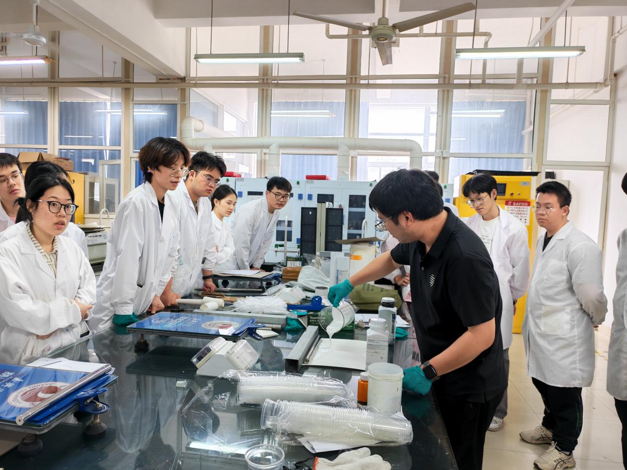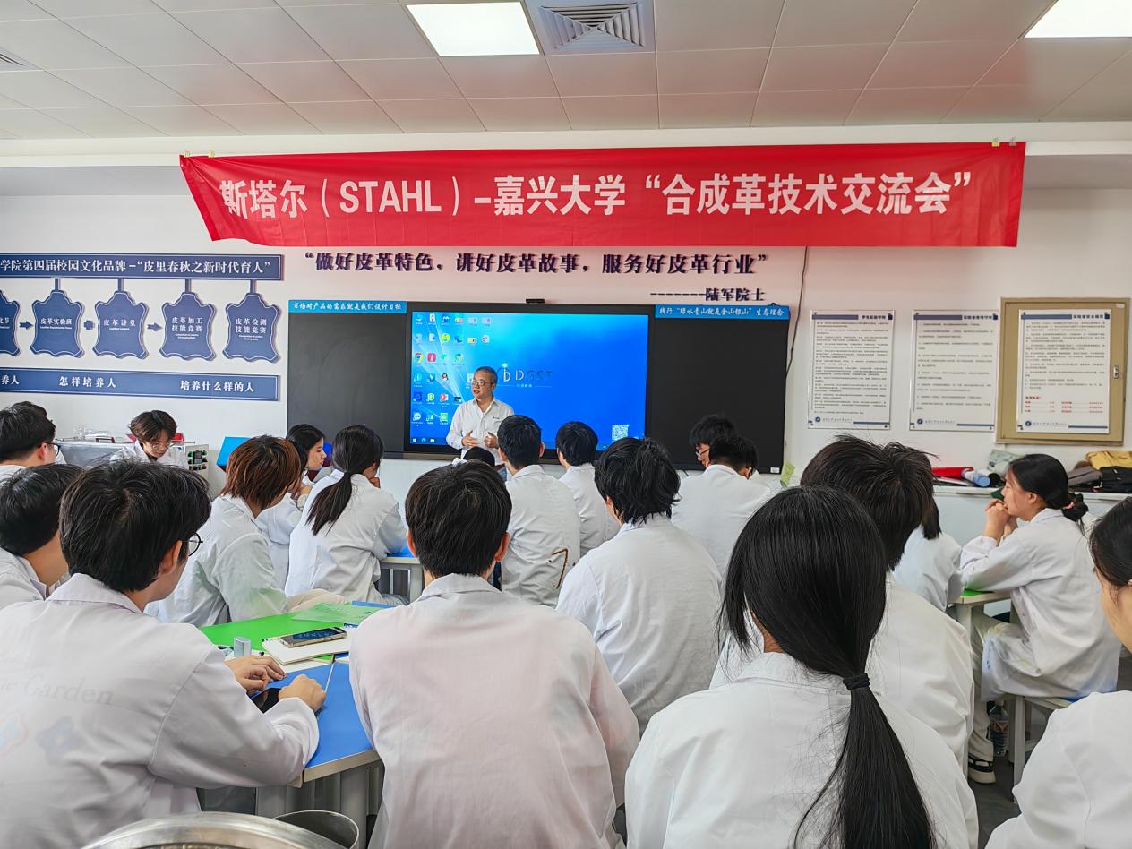 轻化工程专业并给轻化生态合成革班讲授“时尚皮革与合成革现代产业学院”的产业课程之《合成革工艺学》中的“合成革表面处理技术”、《时尚合成革设计与制作》中的“合成革干法与表面处理技术”。活动由罗建勋教授主持,马贺伟副教授、李书卿老师等轻化工程专业教师全程参加。