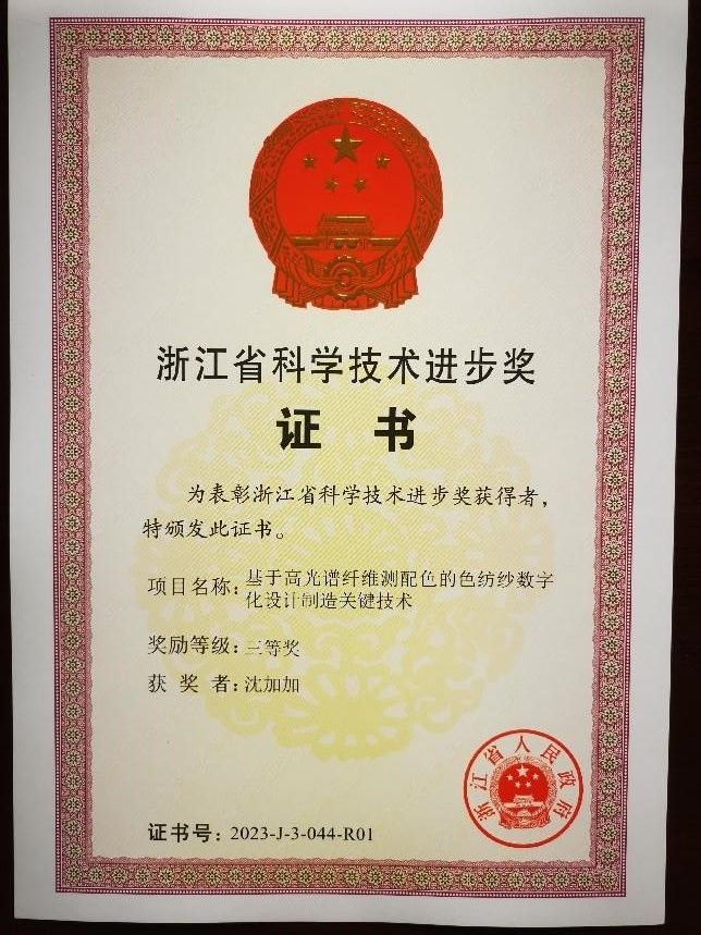拷贝漫画 沈加加教授与浙江理工大学、浙江厚源纺织股份有限公司、浙江理工大学上虞工业技术研究院有限公司共同合作完成的“基于高光谱纤维测配色的色纺纱数字化设计制造关键技术”荣获省科技进步奖三等奖,该奖项拷贝漫画 为第一完成人
