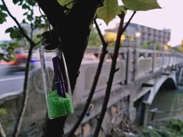 4月23日晚上18:00,活动进入下一个阶段——“心灵摆渡”。为了吸引往来同学,心理中心工作人员小心翼翼的将一个个晶莹剔透的小瓶子悬挂于老食堂马路边的小树上,等待“摆渡人”的摘取,一句句心声就这样传递到陌生友人的手中。通过纸条上自愿留下的联系方式,开启一段段新的故事。