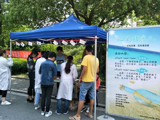 4月22日一早,伴随着和风与朝阳,材纺学院心理中心工作人员在梁林校区老食堂门口搭起了“大本营”。精美的宣传展板、炫彩的漂流瓶、精致的明信片很快便吸引了往来同学。在工作人员的引导下,他们将自己的心情、心事、心愿写在纸上,封入漂流瓶中,期待遇到自己的有缘人。直中午12点半,66个漂流瓶全部封存,“心语漂流”环节告一段落。