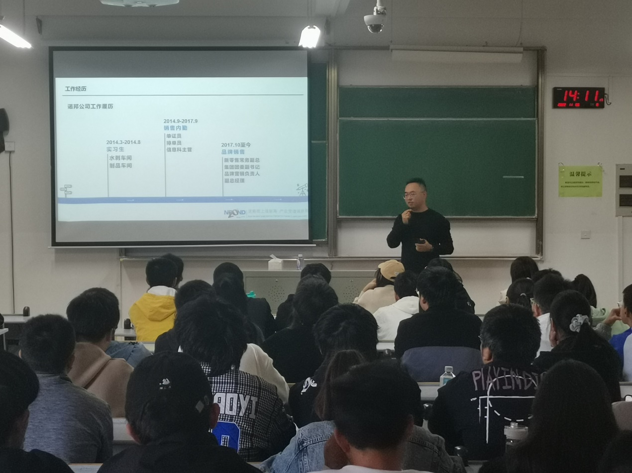 为凸显优秀校友的榜样力量,让大一新生充分了解专业,深入认知专业,清晰规划好大学专业学习和生活,11月6日下午,2014届纺织工程专业优秀校友方振翔副总经理(杭州小植家健康护理用品有限公司,诺邦股份全资子公司)受邀请回母校为纺织工程、非织造材料与工程专业大一学生作专场报告,分享励志故事,分享专业学习心得。纺织工程系主任沈加加、任课老师曹建达和22级纺织工程、非织造材料与工程专业120余名学生聆听了报告,报告由纺织教工党支部书记韩万里主持。