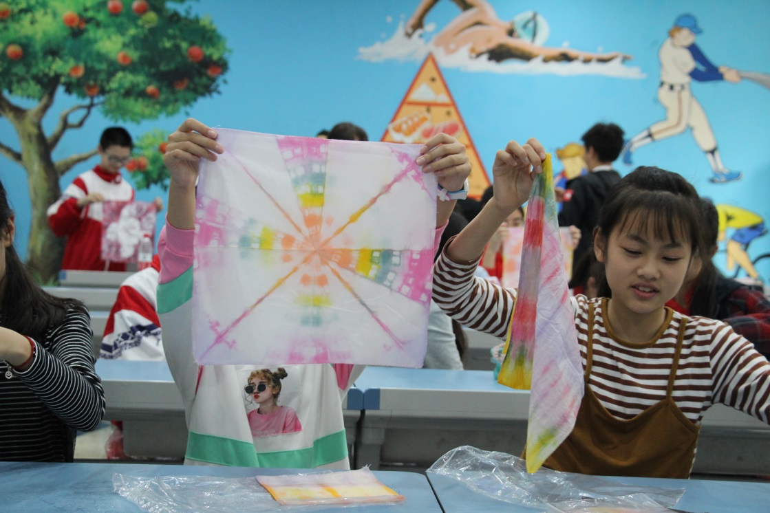 首先,双方党员师生联合组织开展了扎染手工艺实践教学,32名小学生在党员哥哥姐姐们的指导下,发挥想象,充分展现艺术才能,用不同的色彩诠释自己对扎染的理解,完成一件件独具特色的作品。