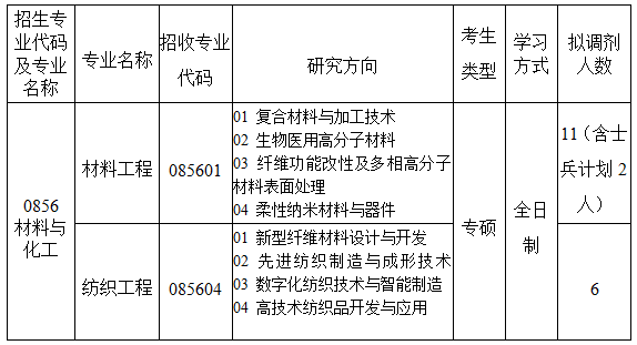 (2)调剂考生第一志愿专业与调入专业相同相近,或初试科目与调入专业初试科目相同相近。本学位点接受调剂的第一志愿专业范围包括:材料与化工(0856)、材料科学与工程(0805、0773)、纺织科学与工程(0821)、轻工技术与工程(0822)、纳米科学与工程(0877、0789、1406)、化学工程与技术(0817)、环境科学与工程(0830、0776)、生物医学工程(0831、0777)、药学(0780、1007、1055)、食品科学与工程(0832)、生物工程(0836)、生物与医药(0860)、化学(0703)、生物学(0710)、电子科学与技术(0809、0774)、计算机科学与技术(0812、0775)、电子信息(0854)、软件工程(0835)。