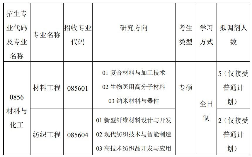 接收材料与化工专业学位硕士研究生调剂》,仅接受普通计划。