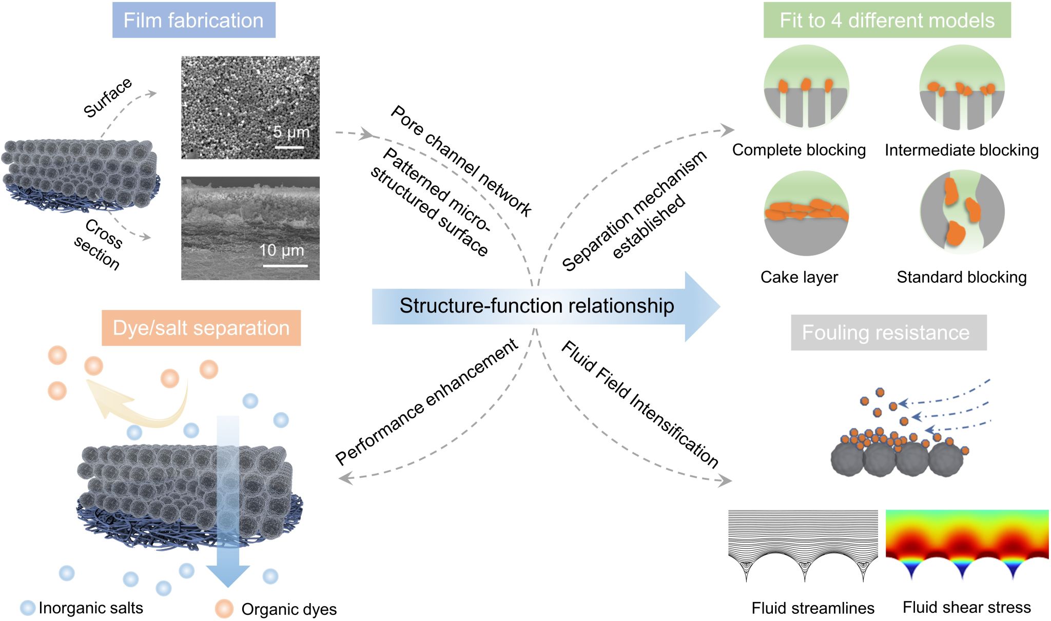 Structure-function relationship for functional films with constructed graded channels in dye/salt separation and fouling resistance