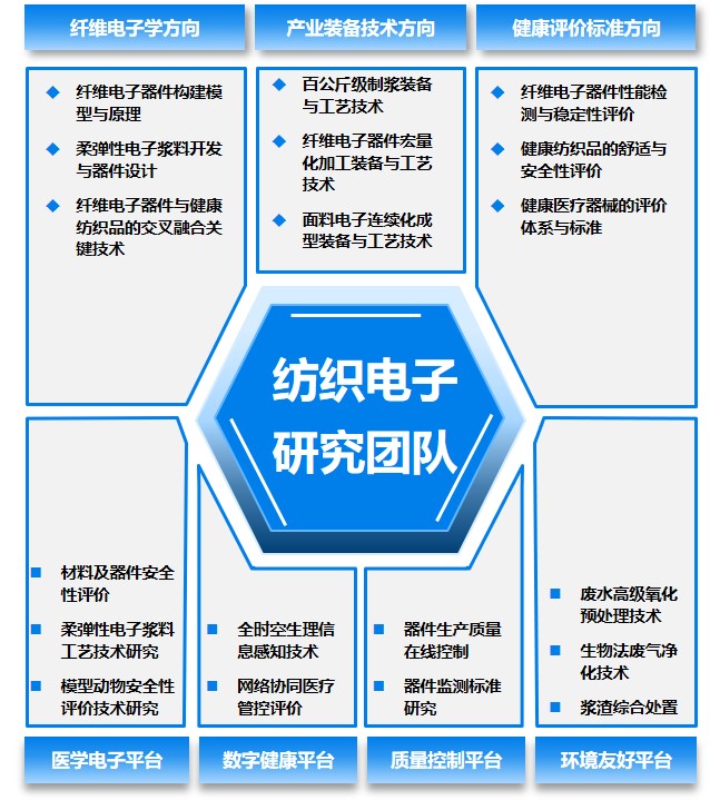 面向人民健康发展需求,本课题组聚焦现代纺织与柔性电子融合,主要从事纺织基器件的结构设计、理论成型、中试应用、制备技术等相关工作,并注重生物安全性、机械可靠性与应用兼容性等特定环境应用因素,为抢占健康理疗用纺织基器件产业化制高点奠定了核心基础